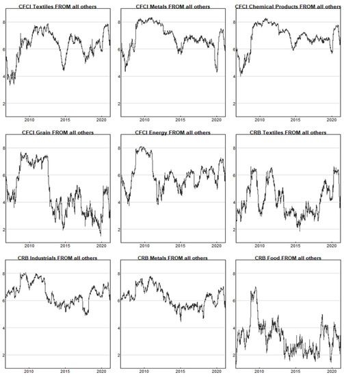 As can be seen from Figure 4, the total net volatility spillover index of global commodities generally fluctuates between −4 and 4. In general, the total net volatility spillovers of CFCI Metals, CFCI Chemical Products, and CRB Industrials to all other varieties are mainly positive, signifying exportation of risk. The total net volatility spillover indexes of CFCI Textiles, CFCI Grain, CFCI Energy, CRB Textiles, and CRB Food are generally negative, indicating importation of risk. While affected by the relationship between supply and demand, the total net volatility spillover index of CFCI Grain rose from −0.93 to 5.19 on 31 August 2018, surging by 6.12. CFCI Textiles and Chemical Products were also affected, and the total net volatility spillovers fell significantly on the same day. Affected by the surge in the US dollar exchange rate, the total net volatility spillover index of CRB Metals also increased from −0.53 to 2.7 on 10 February 2015, and there was a prominent peak in the net volatility spillover chart.