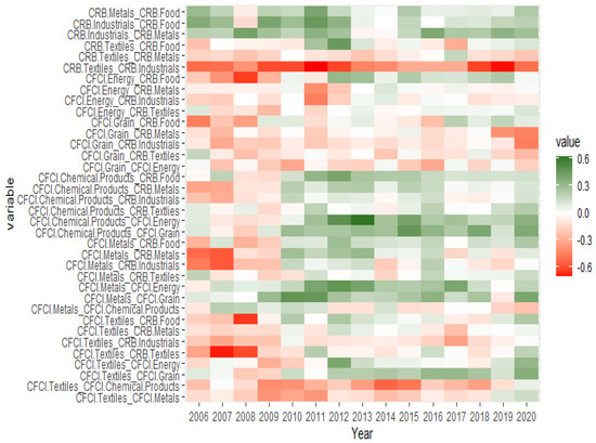 Figure 5 is the heat map of the pairwise net volatility spillover index between commodities over the years based on Equation (8). Noting the symmetry of the pairwise net volatility spillover index, we can see that the color of CFCI Textiles_CFCI Chemical Products and CFCI Textiles_CFCI Metals is mostly red, and the color of CFCI Chemical Products/Metals_CFCI Energy/Grain is mostly green, indicating that CFCI Metals and Chemical Products were the main exporters of risk within China’s commodities market. On the other hand, the color of CRB Industrials_CRB Metals/Food is mostly green, and the color of CRB Textiles_CRB Industrials is mostly dark red, suggesting that CRB Industrials had a positive volatility spillover on other international commodities and was the main exporter of risk within the international market. From the perspective of the interaction between China’s and foreign commodities, the color of CFCI Energy/Grain/Textiles_CRB Industrials is mostly red, indicating that CRB Industrials exported volatility to China’s commodities market. It is worth noting that the volatility spillovers of other China’s and foreign varieties to CFCI Grain are positive. We can also see the dark red color of CFCI Textiles_CRB Textiles for 2007–2008, suggesting that the CRB Textiles exported strong volatility risk to CFCI Textiles during the financial crisis period. However, during the COVID-19 pandemic period, the risk spillover of CFCI Textiles to CRB Textiles switched from negative to positive, and the color between CFCI Textiles and other commodities is also green, suggesting that CFCI Textiles had become the main exporter of risk during that period.