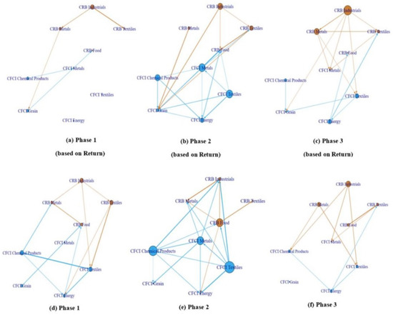 Next, we draw the network topology of variance decompositions suggested by Diebold and Yilmaz [13] for the net volatility spillovers between China’s and foreign commodities during the three different periods. The results are presented in Figure 6. As can be seen from Figure 6, the volatility spillover network diagrams based on Return are qualitatively the same as those based on VaR. The lines of the network before the pandemic are relatively sparse, indicating that the risk contagion between commodity markets is not prevalent. We can see in Figure 6b,e that the number of blue lines in the network diagrams increases sharply, and the nodes of CFCI Textiles, CFCI Chemical products, and CFCI metals are larger in Phase 2 compared to those in Phase 1, suggesting that they are the main risk exporters during this period, consistent with the results from Table 4. Meanwhile, the increased incidence rate of workers, supply chain disruption, and economic embargo measures adopted by many countries had a strong negative impact on the global food supply. As a result, the price index of CRB Food plummeted from 324.26 to 275.91, which significantly accelerated the risk spillover of CRB Food. Therefore, the node of CRB Food in Figure 6e became significantly larger.