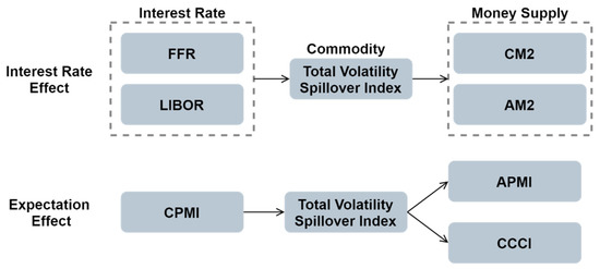 Combined with the causality results in Table 7, the risk contagion mechanism diagram is summarized in Figure 7. We found that when the volatility spillover level of the commodity markets changes under the impact of interest rate level, it will have an impact on the money supply of China and the United States; that is, the path of risk contagion is “interest rate → commodities → money supply”. From the perspective of economic expectations, the causality of “China’s economic expectation → commodities → foreign economic expectation” shows that China’s economic expectations will have an impact on the risk contagion of commodity markets, and then affect the economic expectations of foreign manufacturing. This result may be related to China’s status as a world factory and manufacturing power. In addition, the risk contagion of commodity markets will also have an impact on the global consumer confidence index, with a one-way causal relationship of “commodity → consumer confidence”.