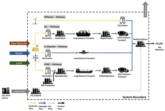 For the MeOH synthesis, an operating pressure of 80 bar was assumed, which makes further compressing steps necessary for the CO2 input flow as well as for the H2 input flows for the offshore and LOHC pathways. The pipeline and LH2 pathways deliver the H2 at around 100 bar or 500 bar, respectively, and no additional compression is necessary. The required electricity for the compressors is provided by the German grid mix. As material input, 1.42 kgCO2 and 0.197 kgH2 are required per kg MeOH [23,76]. For the scale of the plant, 100 ktMeOH per year were assumed, which corresponds to the largest CO2-based MeOH plant being built at the moment [77]. For the fossil-based MeOH production, a process for the German market from the ecoinvent database was used as a reference process.