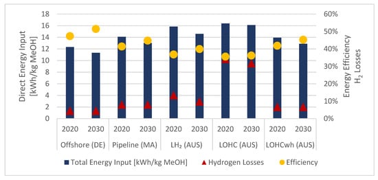 The results for the energy balances for the production of 1 kgMeOH show how much energy is directly required for each pathway and how much of it is lost in the production and transport processes (Figure 2). For the methanol, a lower heating value of 21 MJ/kg was assumed. The balances are further differentiated in energy efficiency values, i.e., how much of the energy input is lost within the product system, and how much H2 is lost due to dissipation or its use in transformation processes.