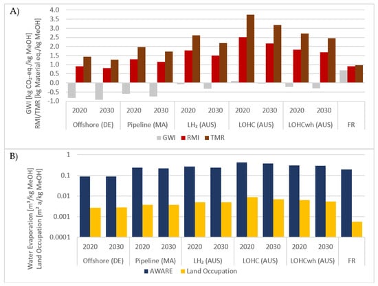 Results of (A) the climate and material as well as (B) the water and land footprint for fossil (FR) and CO2-based MeOH production in 2020 and in 2030, based on different production pathways for H2. For the fossil reference, no substantial deviations can be expected for the future, wherefore only the values for the status quo were considered. (AUS = Australia, DE = Germany, FR = Fossil Reference, MA = Morocco, LH2 = Liquefied Hydrogen, LOHC = Liquid Organic Hydrogen Carrier, Offshore = H2 production with electricity from an offshore wind park, wh = waste heat usage; GWI = Global Warming Impact; RMI = Raw Material Input; TMR = Total Material Input; AWARE = Available Water Remaining).