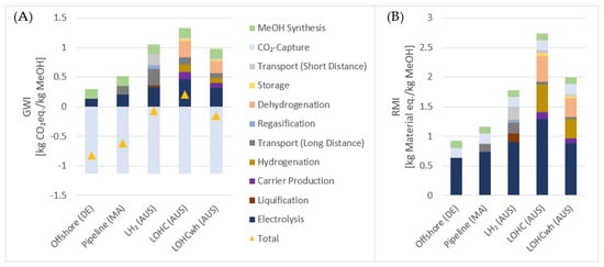 Process contributions to (A) the climate and (B) the material footprint for all considered MeOH production pathways. The legend refers to both graphs. (AUS = Australia, DE = Germany, MA = Morocco, LH2 = Liquefied Hydrogen, LOHC = Liquid Organic Hydrogen Carrier, wh = waste heat usage; Offshore = H2 production with electricity from an offshore wind park; GWI = Global Warming Impact; RMI = Raw Material Input).