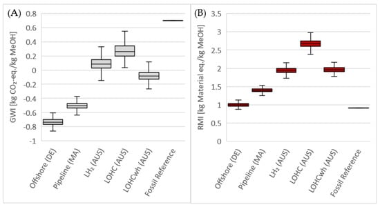 Box plots showing the uncertainty distribution of (A) the climate and (B) the material footprint for all considered MeOH production pathways. Outliers are not shown for graphical reasons. (AUS = Australia, DE = Germany, FR = Fossil Reference, MA = Morocco, LH2 = Liquefied Hydrogen, LOHC = Liquid Organic Hydrogen Carrier, wh = waste heat usage; Offshore = H2 production with electricity from offshore wind park; GWI = Global Warming Impact, RMI = Raw Material Input).