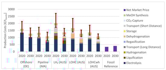 Production costs for CO2-based MeOH, including cost ranges. The values for 2030 represent nominal values, i.e., no adjustment for a future inflation rate is conducted. (AUS = Australia, DE = Germany, FR = Fossil Reference, MA = Morocco, LH2 = Liquefied Hydrogen, LOHC = Liquid Organic Hydrogen Carrier, Offshore = H2 production with electricity from offshore wind park, wh = waste heat usage).