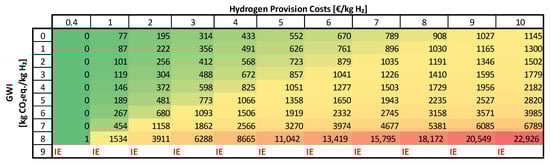 CO2-avoidance costs for CO2-based methanol production in Germany, depending on the production costs and climate footprint of the used H2. (GWI = Global Warming Impact, IE = Increase in Emissions).