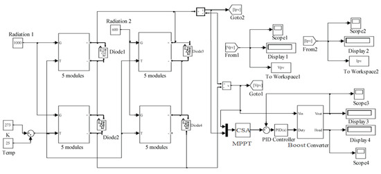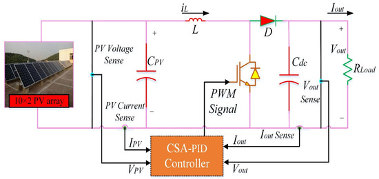 The boost converter plays a very significant part as it boosts the PV array terminal voltage with the variation of the duty cycle. The duty cycle will be calculated depending on the signal of the MPPT, whether it is CSA-PID, CSA, MPSO, PSO, or MP&O. The Simulink model of the complete system used to estimate the capability of CSA and its performance is compared to the most popular MPPT techniques, i.e., MP&O (conventional) and CSA, MPSO, and PSO (soft computing), and the schematic diagram of the proposed system, which shows the overall PV system when connected to the proposed CSA-PID predictor, is clarified in Figure 8. It consists of a 10 × 2 PV array, an MPPT tracker, a DC-DC converter, and the load.