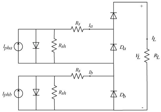 As shown in Figure 3, an example of a single-string array consisting of two photovoltaic cells, which are wired in series, is presented. In this example, one cell is shaded while the other is not, therefore both photon and output currents of the shaded cell are less than the unshaded cell as Ipha < Iphb, and Ia < Ib. In addition, the specific operation modes have the following conditions: