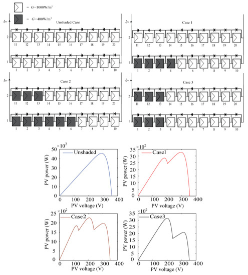 The PV system consists of (10 × 2) arrays, the temperature is 25 °C, and the system is exposed to two different irradiance levels, 1000 W/m2 and 400 W/m2, respectively. The output power under different shading cases is shown in Figure 4, and the position and value of the corresponding maximum PV power and voltage are presented in Table 2. The theoretical output power of the PV array greatly varies under different shadow distributions. The best shadow distribution is (4:0) and the corresponding maximum output power is 3.27 kW. The worst shadow distribution is (6:3) and the corresponding maximum output power is 2.27 kW. The difference between the optimal distribution and the worst distribution is 1 kW, which is almost 30.5% of the maximum power in the optimal case. The distribution is more diverse, and the difference between the best distribution and the worst distribution will continue to grow. As shown in Figure 4, the maximum output power is proportional to the magnitude of the solar irradiation. Moreover, with the decrease in the solar irradiation level received by the shaded photovoltaic cell, the global maximum power point is gradually shifted to the voltage drop direction.