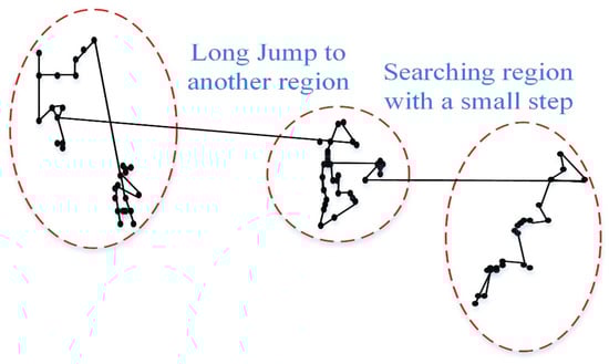 Figure 5 is an instance of Lévy flight in a two-dimensional area. Because of the advantages of tax distribution, these steps are composed of many small steps, big steps, and long-distance jumps. Moreover, compared to other heuristics algorithms, these long-distance jumps can meaningfully improve the efficiency of the cuckoo search, especially for multimodal and nonlinear problems.