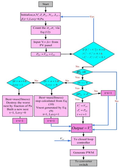 Figure 6 displays the flow chart of the suggested technique, initializing all constants and variables, i.e., voltage, current, power, number of samples. We use the current value of voltage and current to compute the power. The new values of voltage and power are deposited in the voltage and fitness arrays , respectively. In addition, before each iteration begins, a check is performed to determine whether the sample has reached convergence or otherwise. If the samples are close to MPP, they will be merged into the same value, and the corresponding power will be merged into the same value [47]. If all samples do not converge, all power values of the corresponding samples are restrained and deposited in the fitness array. Through the estimation of the array, the sample with the largest power is selected as the best sample. After that, according to Equation (10), all other samples are enforced to keep moving to this optimal value. Performing Lévy flight will then calculate the steps described in Equations (11) and (12). Therefore, a new set of samples was found. Then, the corresponding power of these new samples is restrained from the photovoltaic panel. Besides, if any sample results in low power, the specific sample is ignored and a new sample is produced. This iteration will continue until all samples have reached the greatest MPP [47].