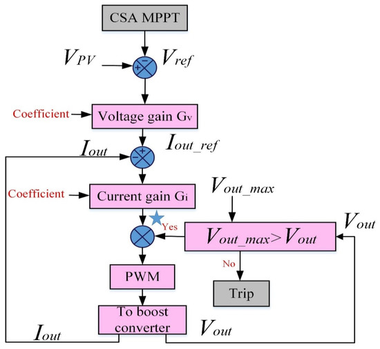 The gain of the PID controller can be obtained by the trial-and-error method. Here, 2-pole 2-zero 50 KHz controllers are used to close the inner DC-DC boost current loop and the outer input voltage loop. The MPPT algorithm provides the reference input voltage VPV_ref to enable the panel operation at the maximum power point. Here the sensed input voltage of the panel VPV is compared with the reference voltage VPV_ref generated by the MPPT controller. The deviated output of the comparator is fed into the voltage control loop (Gv), which is an outer voltage loop that regulates the input voltage and current of the boost stage that can be controlled by an inner current loop. The output of the voltage controller Iout_ref is compared with the DC-DC converter output current Iout feedback in the current control loop (Gi). The output of the controller decides the amount of duty cycle to be instructed to the PWM so as to regulate the input voltage.