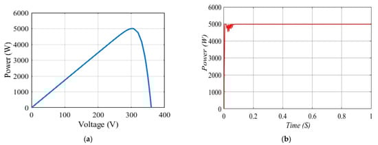 The purpose of this test is to determine the speed at start-up (from zero). The PV array is constructed using the modules described in Table 1 and configured as two strings of 20 modules. The proposed CSA-PID controller is examined at STC, of which the GMPP at STC is 5000 W as seen in the PV curve in Figure 9a. The proposed method is simulated for 1 s. The response results of power are shown in Figure 9b. It can be observed that MPP is tracked within 0.1 s, which is quick enough to match the real atmospheric changes because the changes in irradiance and temperature take at least a few seconds. An important feature of CSA-PID is that it can track GMPP effectively without any error. The output power of the CSA-PID method is 5000 W without any power loss. Under steady-state conditions, the operating point is stable at MPP, that is, the oscillation is almost zero. This is in contrast to P&O (and other traditional methods), where oscillations around MPP are established.