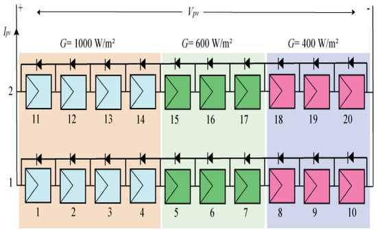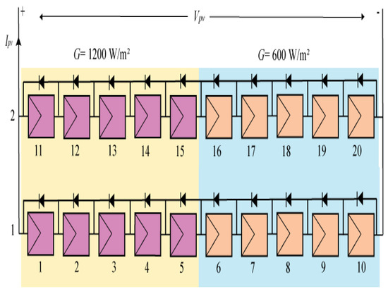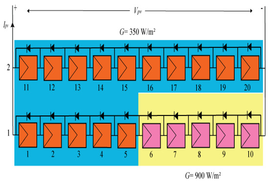 In this work, the schematic diagram of the proposed system, which shows the overall PV system connected in series and parallel, is presented in Figure 2. It consists of a 10 × 2 PV array. For PV array simulation, the simulated PV module has the same parameters as the UP-S250 module in the standard test condition (STC) as shown in Table 1. The PV system has been modeled using MATLAB/Simulink to provide the required output voltage and output currents. The inputs of the PV system are the radiation and temperature, as well as other parameters that have been taken into consideration. Four subsystems have been modeled in MATLAB/Simulink to mimic the PV system when it runs under PSCs. Each subsystem is made up of five modules that are linked together in a series. To decrease power losses, bypass diodes were also attached to each subsystem. All subsystems obtain varied quantities of radiation and a constant temperature as the input. As a result, every two subsystems are linked in series, and then the entire subsystem is connected in parallel, as shown in Figure 2, to obtain the entire system as suggested in the model related to our experimental platforms.