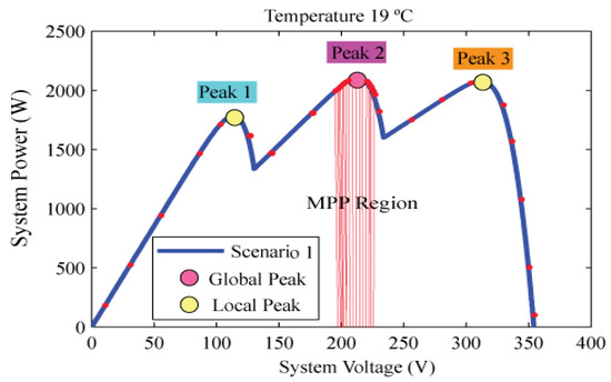 Output P–V characteristic curves under different shadow distribution cases under study.