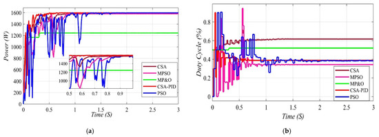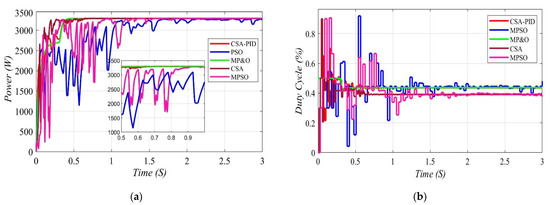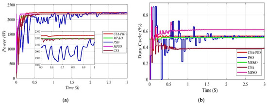 Details of duty cycle and power of proposed CSA-PID, CSA, MPSO, PSO, and MP&O controllers under scenario three. (a) The output power of proposed CSA-PID, CSA, MPSO, PSO, and MP&O. (b) The output duty cycle of proposed CSA-PID, CSA, MPSO, PSO, and MP&O.
