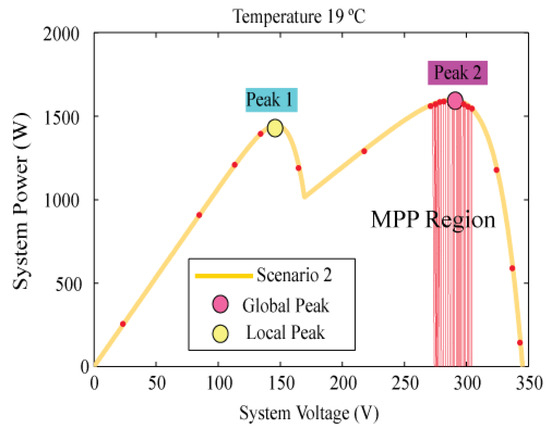Table 5 summarizes the partial shading distributions of each scenario, in which the global maximum power is effectively extracted within a short time of less than 0.5 s with free oscillations, as shown in the figures, which prove that the proposed method may easily track the global peak without any difficulty. As mentioned in Table 6, the proposed tracking method can distinguish between the local and global peaks for each scenario. As a result, the system performance was improved, and the output power values obtained by the proposed tracker were close to the maximum power and better than the output power values obtained by other trackers.