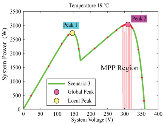 In scenario three, the PV system is examined under two patterns of partial shading in which the solar irradiation values are 1200 and 600 W/m2 and the temperature is 19 °C, as shown in Figure 17. As illustrated in Figure 18, the PV curve of scenario three has only one local peak (3000 W) and only one global peak (3300 W). Furthermore, as Figure 19 shows, the CSA-PID control method can track the maximum power successfully for any partial shading condition scenarios. The simulation results demonstrate that this technique can extract the actual maximum power point rapidly with high efficiency and negligible oscillations around the global point of maximum power under partial shading conditions for various scenarios.