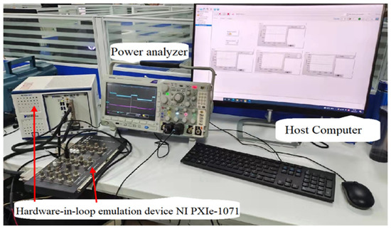 The experiment platform is set up to verify the effectiveness of the suggested CSA-PID approach. NI PXIE-1071 is used to implement the control technique. As illustrated in Figure 20, NI PXIE-1071 uses HIL software to perform hardware-in-the-loop simulation. The FPGA board of NI PXIE-1071 implements the system’s power circuit. The sampling and control circuit is transformed into a C program using Simulink’s NI standard C language code generation and is loaded into NI PXIE-1071′s control board; the sampling frequency is 10kHz. By connecting an external port board to a set of ports defined inside NI PXIE-1071, the experimental results are presented on the power analyzer.