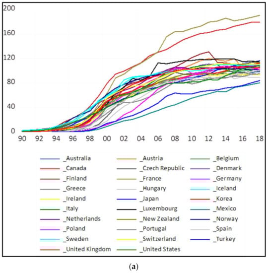 According to World Bank’s Data Bank [1], only 0.23% of the total population of the Organization for Economic Cooperation and Development (OECD) used the Internet in 1990, but this increased to 83.24% in 2018. Furthermore, the number of mobile cellular subscriptions (per 100 people) was only 0.96 in 1990, but it increased rapidly to 121.35 in 2018. Figure 1a illustrates the weighted average of individuals using the Internet per 100 people and mobile cellular subscriptions per 100 people for each selected OECD member country. Although there are differences by country, this generally indicates that the penetration of the Internet and mobile phones has increased rapidly over the past 38 years. These two indicators are evaluated to assess the development of ICT.