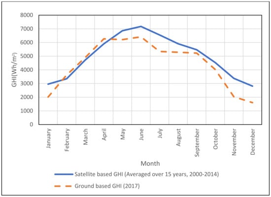 Satellite-based data are acquired on the basis of forecasting techniques. Some satellite-based forecasting techniques use position of clouds to estimate solar energy over a particular location. A study showed that motion vectors were used to predict the upcoming position of the clouds over particular location of the ground and it was noted that they provided fine forecasting accuracy of almost 6 h. Predictions from cloud pose several problems to properly forecast solar irradiance []. Therefore, comparison of satellite-based solar data and ground-based measured solar data has been of much importance to many researchers across the globe. Vignola et al. [] conducted a study at Kimberly, Idaho in which satellite-based solar data and ground-based solar data were analyzed to validate the satellite-based solar model. It was found that mean bias error for satellite-based global irradiance was 5% and it was 2% for beam irradiance. Similarly, Blanksby et al. [] conducted a research in Australia to check the accuracy of satellite-based solar model. It was noted that for lesser values of GHI, satellite-based data were overestimated compared to the ground-based data. However, for greater values of GHI, satellite-based data were either overestimated or underestimated compared to the ground-based data.