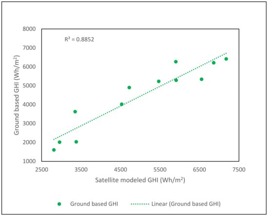 The correlation of satellite-based GHI with ground-based GHI has been developed and shown in Figure 6 where each data point represents a month. There is a substantial positive correlation between satellite and ground-based GHI. The value of R2 for the correlation is 0.8852 which shows that there is high correlation between these two.