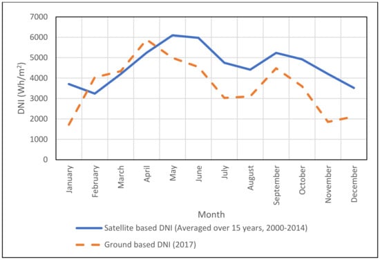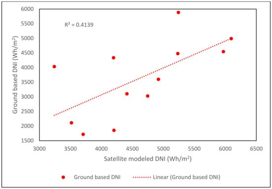 Comparison of ground-based monthly DNI with satellite-based DNI.