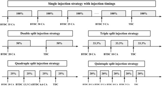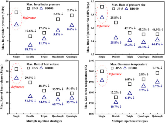 Figure 8, the triple-injection strategy had the lowest results among the multiple-injection strategies for the following reasons. First, the last injection quantity was smaller than that of the double-injection mode, which reduced the combustion period. Each injected mass in the triple-injection strategy was 33.3% of that of the single-injection strategy. Second, each injection quantity of the quadruple and quintuple-injection strategies was smaller than that of the triple-injection strategy; however, the dwell time between fuel injection timings was more reduced than that of the triple-injection strategy. Owing to the shorter dwell time and the increased number of injections, the mixture burned in a rich condition. The results of the quintuple-injection strategy in
