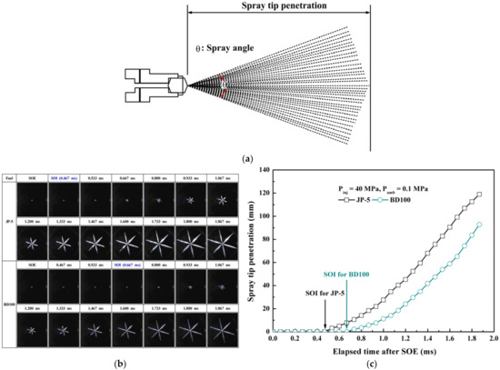 Figure 3c shows the results of the spray tip penetration based on the images acquired by the high-speed camera. The spray tip penetration by the definition (