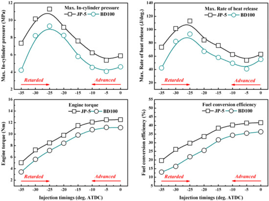 Figure 4 shows the influences of fuel injection timing on the maximum in-cylinder pressure, maximum ROHR, engine torque, and fuel conversion efficiency.