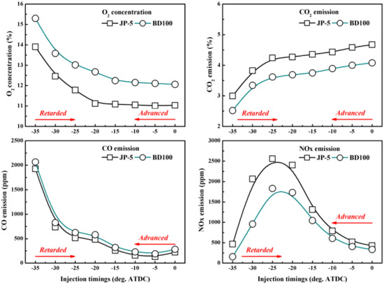 2, CO, and NOx characteristics of JP-5 and biodiesel with different fuel injection timings.