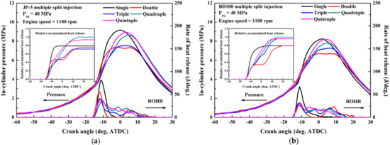 Figure 6 shows the results of the in-cylinder pressure and ROHR curves for JP-5 and biodiesel for the multiple split injection strategies.