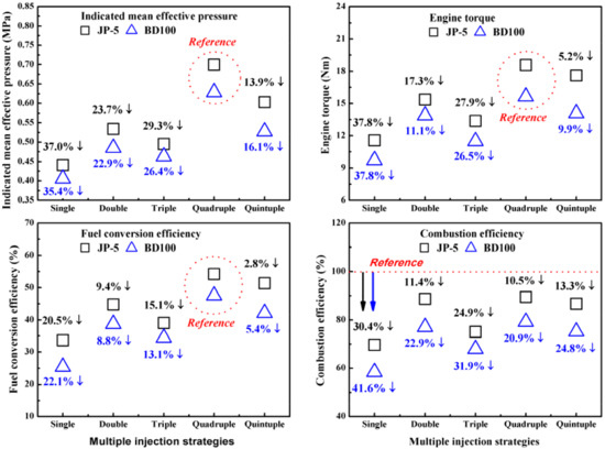 Figure 8 are considered inferior to those of the quadruple-injection strategy because the fuel injection quantity is less than that of the quadruple strategy.