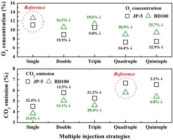 2 is proportional to the combustion rate of the injected fuel. The quadruple strategy, which had the lowest O