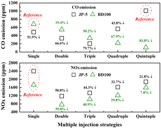Figure 10 shows the CO and NOx emission levels of the multiple-injection strategies. With the single, double, and triple-injection strategies, the CO emissions of biodiesel were greater than those of JP-5. Interestingly, less CO reduction was observed in the quadruple and quintuple strategies compared with JP-5. As presented in