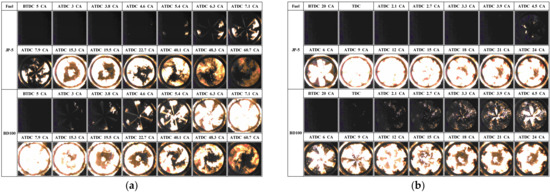 Figure 3b shows images of the spray behavior of the JP-5 and biodiesel. It has been reported that JP-8 has an asymmetric spray shape owing to the strong turbulence of the internal nozzle from a valve orifice covered-type injector [