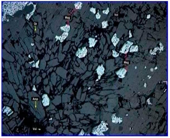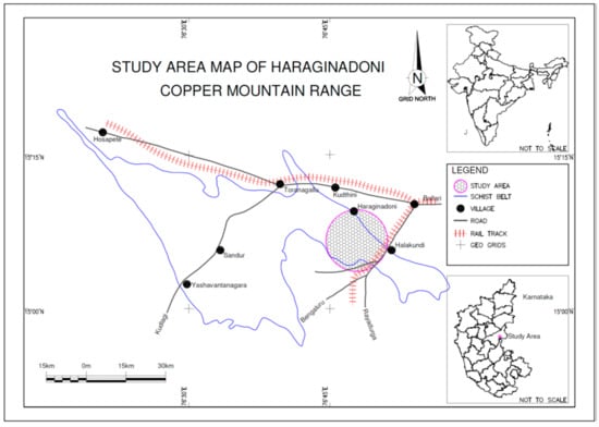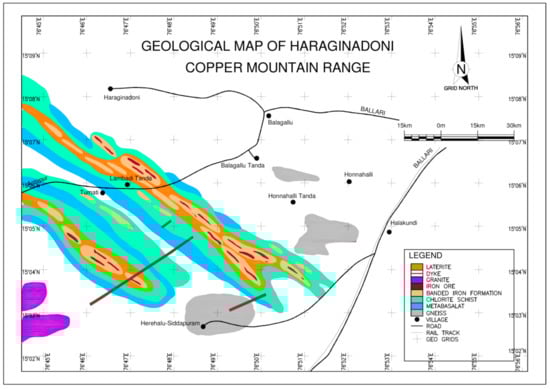 Banded hematite quartzite (BHQ) is a low-grade iron ore with an iron content ranging between 37% and 44%. India has 22,487 million tons of hematite iron ore resources, and 5422 million tons in the reserve category. Karnataka State, mainly the Sandur schist belt, accounts for about 11% of this hematite iron ore resources. The area under investigations forms the southern part of the Sandur greenstone belt and lies between longitude 76°4500″and 76°52′40″ east and latitude 15°00″ and 15°9′30″ north (Figure 1). The survey of India topo sheet no. 57A/16 includes part of the Ballari District of Karnataka and part of the Ananthpur District of the Andhra Pradesh states. The area is accessible from Haraginadoni, about 16 km west of Ballari. Since 1838, a number of researchers have worked on the various lithological units of the Ballari District, with particular focus on the Sandur greenstone belt. Still, very few have performed studies on the Haraginadoni area. Captain New bold was the first to traverse various parts of the Ballari District to study rock formations and reported copper mineralization in the Sugalammadevi Konda area of Copper Mountain [1]. Later, Bruce Foote identified granite, gneiss, and schistose formations in the Sandur greenstone belt. He found traces of copper mineralization in the old workings of the shallow caves of the Copper Mountain Range. The occurrences of aegirine and riebeckite in the BIF of the southern part of the Copper Mountain Range [2]. They concluded that thin ferruginous layers containing aegirine and riebeckite are metasomatic in origin. They also reported the presence of a diabase dyke in the Haraginadoni area of the Copper Mountain Range. Roy and Biswas [3] studied the structures of the Sandur greenstone belt. According to them, the Copper Mountain Range is a syncline, plunging towards the northwest at a moderate angle of 35°. To the south of the Copper Mountain Range, there are two subsidiary folds, a syncline and an anticline, characteristic of the en échelon type of macroscopic fold. A geological map of the Haraginadoni area is shown in Figure 2. India also has vast deposits of other low-grade iron ores, such as banded hematite quartzite (BHQ) and banded hematite jasper (BHJ).