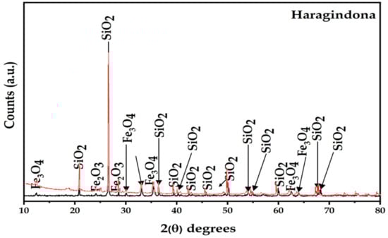 The samples physically appeared as grayish-black, hard, compact lumps 100 mm in size; these exhibited banding, with a specific gravity of 3.2, bulk density of 1.8 t/m3, 32° angle of repose, and a 7.33 Kwh/short ton Bond’s ball mill work index. A representative sample was analyzed as 35.70% Fe, 47.44% SiO2, 0.75% Al2O3, 0.06% Mn, 0.07% TiO2, 0.03% P, 0.02% S, and 0.83% LOI. It is evident from the chemical analysis that the sample contained low iron content with a remarkably high percentage of silica and a marginally high phosphorous content. Incidentally, the alumina content of the sample was low, which is highly desirable for the Indian steel sector. The characteristics of the sample indicated that the BHQ was hard, compact, and abrasive, with amoderate work index value. The sample mainly comprised 40–45% cherty quartz that was <40 µm in size, 35–40% hematite particles with a size of <70 µm, and 15–42% martitized magnetite with a size of <100 µm. The sample also contained trace amounts of very fine-grained amphibole and apatite. The hematite grain size ranged from 100 to 25 µm. Hematite was also present as granular aggregates in the pockets and bands;these appeared as fine inclusions in the hematite grains (Figure 3 and Figure 4). Martitized magnetite occurred as grains and aggregates and was dispersed in the matrix. In some places, the sample also contained trace amounts of apatite and amphibole (Figure 4). The mineralogical findings were confirmed by XRD (Figure 5).