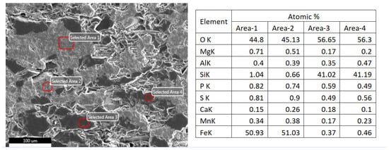 An EPMA study confirmed the mineralogy and indicated that most hematite grains were free at −74 µm (Figure 6). The sample has two distinct types of valuable minerals:(i) predominantly hematite grains having euhedral structure (fine- to medium-grained) with disseminated silicate inclusions and (ii) micro-crystalline hematite particles intermixed with silica grains. Area 1 of Figure 6 shows the hematite-dominant phase and Areas 3 and 4 show the silica-predominant phase, and minor cracks are also observed. XRD phase analysis suggested that the sample contained quartz (40.9%), hematite (42.5%), magnetite (5.6%), zeolite (5%), coesite (4.3%), goethite (0.6%), amphibole (0.6%), and amorphous silica (0.5%), confirming the microscopic ore studies. These results are similar to the findings of previous works by Krishna et al. [18], Nanda et al. [19], and Nadezhada et al. [20] on the characteristics of BHQ upon processing.