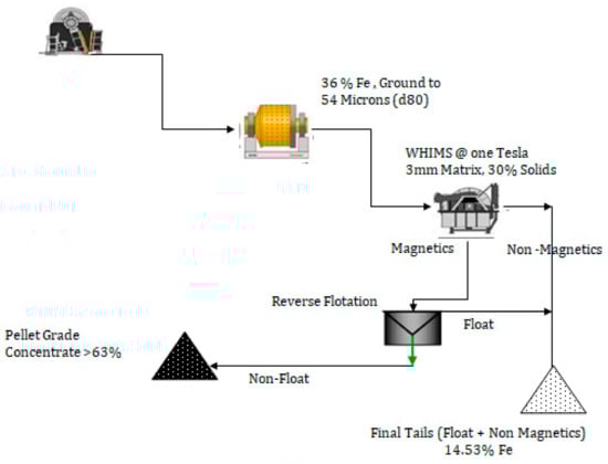 The optimal test consisted of conducting WHIMS at MOG of −74 µm, D80 54 µm, at 10,000 Gauss, flotation of WHIMS magnetic concentrate at 1.5 kg/t of caustic starch depressant dosage, and 0.05 kg/t dodecylamine collector. The results of the final test are given in Table 10. The final fine particle process of WHIMS and flotation produced a concentrate assayed as 63.34% Fe, 6.30% SiO2, 0.20% Al2O3, 0.02% P, 0.02% S, and 0.20% LOI with 0.03 Al2O3/SiO2 ratio, 77.4% Fe recovery, and 68.8% concentration efficiency at 44.0 wt% yield, meeting the specifications required for pellet manufacturing. The sample was more amenable to WHIMS and reverse flotation of WHIMS concentrate than conventional gravity, WHIMS, and the reverse flotation process. High-grade concentrate and a higher concentration efficiency were obtained due to the marginally high martitized magnetite % in the BHQ sample. The reports by Nanda and Gopal Krishna [14] showed that with two-stage WHIMS followed by reverse cationic flotation after grinding, the −74 µm obtained a concentrate assayed as 60% Fe with about 33% iron recovery from the banded hematite jasper sample. Raj et al. [24] indicated that WHIMS followed by flotation yielded better results than flotation followed by WHIMS. The final process flowsheet is shown in Figure 7. The characteristics of the final concentrate and the final tails are given in Table 11 and Table 12, respectively.