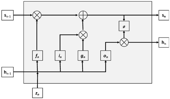 The fading of previously learned patterns is a challenge experienced in standard RNN architectures. The LSTM-RNN has a memory cell to overcome this shortcoming. The memory cell is managed by non-linear gating units. The gated units of an LSTM-RNN unit can be seen in Figure 2. These gated units, the forget gate (fn), input gate (in), and output gate (on), are presented by Equations (5)–(7), respectively. Equations (8)–(10), respectively, present the input node (gn), the state (sn), and the cell state (hn). Here, n is the time step, ∅ is the tanh function, σ is the sigmoid function, and the W matrices are the respective network activation functions’ corresponding input weights. The LSTM-RNN cells are stacked after each other to achieve a deep layered LSTM-RNN. The memory cells give the models the ability to sustain memory.