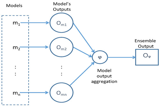 Ensembles of models of the three techniques used in this study, LSTM-RNN, OP-ELM, and DBN, are investigated for UCLF forecasting. Ensemble models are a combination of multiple models to try to achieve better performance than that of the individual models. There is a number of different ways that models can be combined to form an ensemble [30]. Figure 3 shows a summary of the aggregate method, which is commonly used in regression problems. Here, models operate in parallel, and their outputs are aggregated to obtain the ensemble model’s output. The aggregate ensemble model output, , can be written as (16). Here, Omk is the ensemble model’s kth output for models m1, m2 …mn, and n is the number of models used to develop the assembly model. The equally weighted method was used, where each model’s output into the ensemble model is given an equal weight.