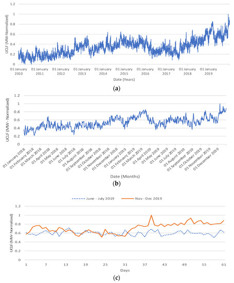 The South African UCLF (MW—normalized): (a) UCLF for a period between January 2010 and December 2019; (b) monthly periodicity of UCLF between January 2018 and December 2019; (c) weekly periodicity for June–July 2019 and November–December 2019.