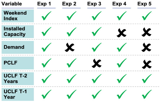 The collected data were for four variables: the installed capacity, demand, PCLF, and UCLF. To investigate how these variables affect the UCLF forecast accuracy of the different techniques, the variables were arranged into five experiments, as shown in Figure 6. A tick indicates that a variable is used in the respective experiment and a cross indicates that the variable was not used in the experiment. The experiment with the best performance will, thus, indicate which variables should be used with which technique to achieve the lowest year-ahead UCLF forecasting error. The installed capacity is the total power that can be generated by the installed power generation plants in megawatts. The demand is the historic total national power demand in megawatts. The PCLF and UCLF are the respective historic variables in megawatts. The UCLF data used for the input in the training and testing of the models were split into the UCLF two years before the target UCLF, UCLF T-2 Years, and the UCLF a year before the target, UCLF T-1 Year. The UCLF data used was a daily peak value. A variable indicating if it is a weekend or a weekday, the Weekend Index, was also used as an input. This variable was a 1 for weekends and a 0 for weekdays. This variable was included for the models to be able to differentiate the data for a weekday and the weekend, respectively. This resulted in six input variables. The training period was between 1 January 2012 and 31 December 2018. The testing period was between 1 January 2019 and 31 December 2019. Thus, the forecasts were a daily peak UCLF for the year-ahead forecast period. All the variables, except the weekend index, were normalized to be between 0 and 1. The training input data were, thus, a 2555 × n matrix, where the 2555 is the daily input values over 7 years and n is the number of variables used in the respective experiment, as described next.