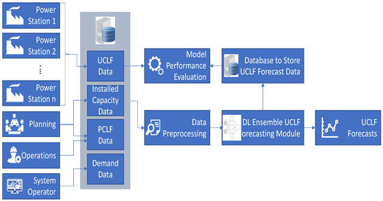 Figure 7 presents the proposed UCLF forecasting system. The power stations monitor their plant’s performance and report this locally at the station and centrally. These data are then stored in a central database. The UCLF data are part of these stored power station data. A record of the power station units that are on planned outages, PCLF, for maintenance or refurbishment is also stored centrally. These PCLF data are then provided by a central planning department in conjunction with the central operations department. The planning department also provides the installed capacity data to the central database. The system operator or an equivalent department would then provide the demand data. The data are pre-processed, and the variables are then consolidated for input into the deep learning (DL) ensemble UCLF forecasting module. The DL ensemble UCLF forecast module contains a DL ensemble model that forecasts the UCLF. The UCLF forecast is then stored and used by the planning, operations, and system operator. The DL ensemble model is developed and tested offline, and then deployed in the system. The UCLF forecast data together with the actual UCLF data are then used by a model performance evaluation module to periodically check if the model’s accuracy is still acceptable based on the utility’s requirements.