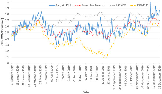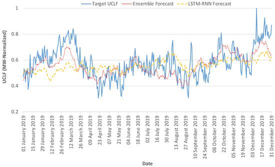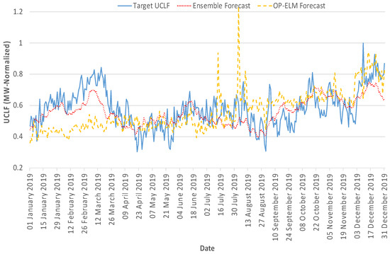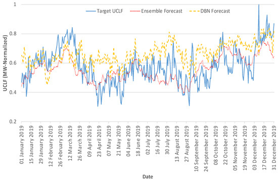 The lowest obtained year-ahead UCLF forecasting errors from each technique are summarized in Table 9. These results show that the lowest UCLF forecasting errors were obtained by the ensemble model. The ensemble model was then followed by the LSTM-RNN, DBN, and then OP-ELM. The two deep learning techniques, thus, achieved higher accuracies than the non-deep learning technique, OP-ELM. It was observed that with all techniques, apart from OP-ELM, the lowest errors were attained in Experiment 1. Experiments 4 and 5 showed a sharp increase in errors, relative to the rest of the experiments with all the techniques. Thus, the exclusion of the installed capacity as an input variable decreased the accuracy of the models of the techniques used. The plots of the target UCLF and the year-ahead forecasted UCLF for the models with the lowest errors per technique are presented in Figure 8, Figure 9, Figure 10 and Figure 11. These plots are plotted for the period of 1 January 2019 to 31 December 2019. Each plot of the individual models also includes the ensemble model with the lowest forecasting error. The plots of the UCLF forecast by the models that make up the ensemble model are plotted in Figure 9.