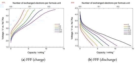 At the end, the cells were tested using the Arbin BT-2043 Battery Test System. The cycling procedure consisted of charge/discharge galvanostatic cycles with cut-off voltages of 1.5 V and 4.5 V. The cells were tested at various current rates, as follows: C/50 (1 cycle), C/20 (4 cycles), C/10 (20 cycles), C/5 (20 cycles), C/2 (20 cycles), C (20 cycles), C/10 (10 cycles). Current rates were calculated for the capacity considering only 2 active sodium ions per formula, i.e., 108 mAh/g.