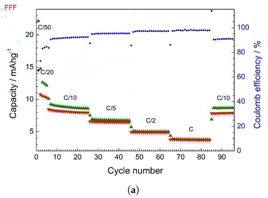 The cathode material FFF reached 22 mAh/g of charge capacity in the first cycle. Values for consecutive cycles were between 15 mAh/g and 3 mAh/g (Figure 4a). During the first cycle, the Coulomb efficiency was 66% and then gradually rose to over 98% at higher currents. The capacities were low, but at the same time, the cycle life of the cathode was good. After 90 charge/discharge cycles, the capacity remained at a similar level (Figure 5a). The discharge curves for all currents were similar in shape (Figure 4b). In the C/50 curve, one can see a tiny plateau around 2.5 V, which vanished at higher currents. Both the charge and discharge capacities were very low—between 3 mAh/g and 15 mAh/g—and strongly depended on the current rate.