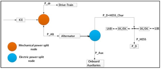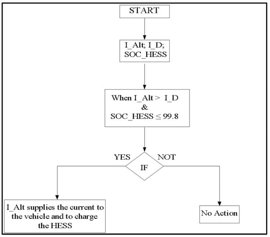 - and : This is when the vehicle is in operation, and the alternator is producing more energy than required by the vehicle. The difference is used to charge the HESS.
